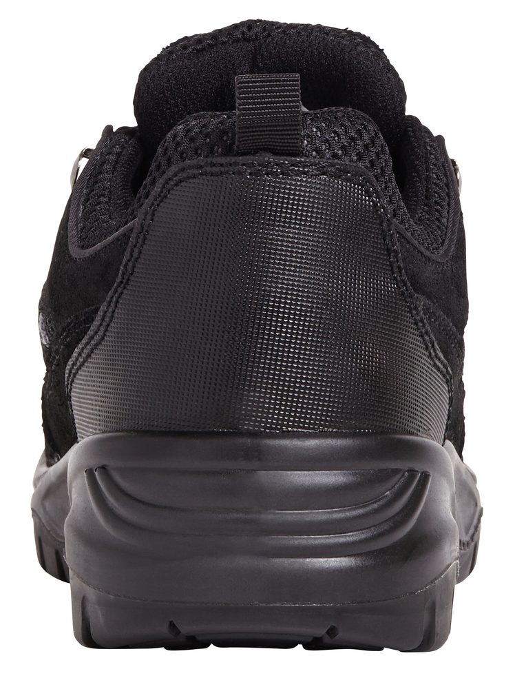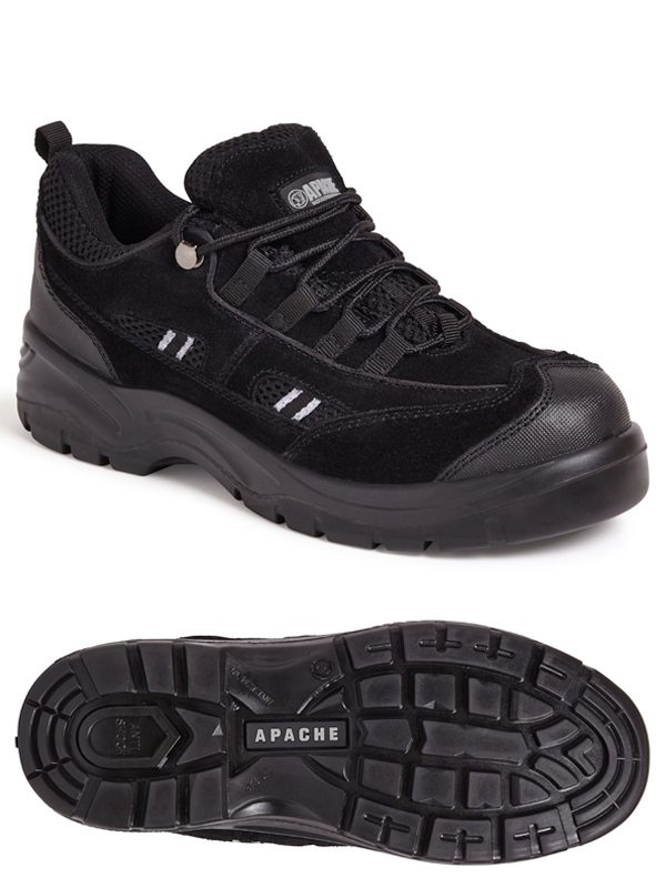 - Black Suede Safety Trainer • Suede Leather • Black suede safety trainer. Padded collar and tongue for added comfort. Steel toe cap and steel midsole protection. Anti-scuff toe guard. Dual density polyurethane outsole. Anti-Static. A good all round shoe for most trades.