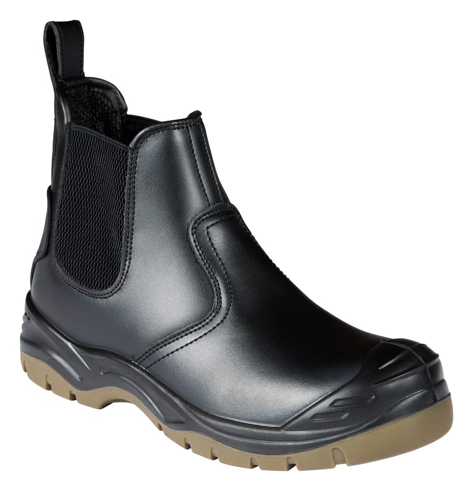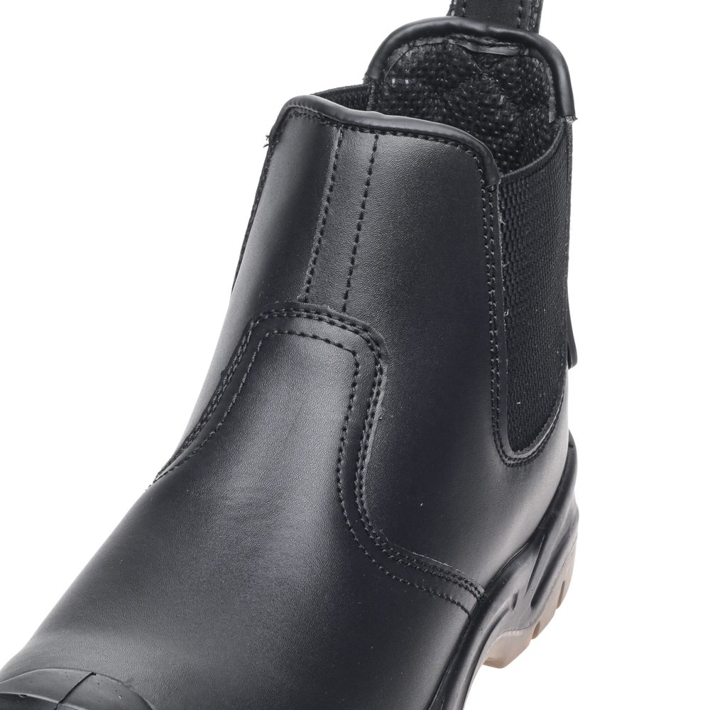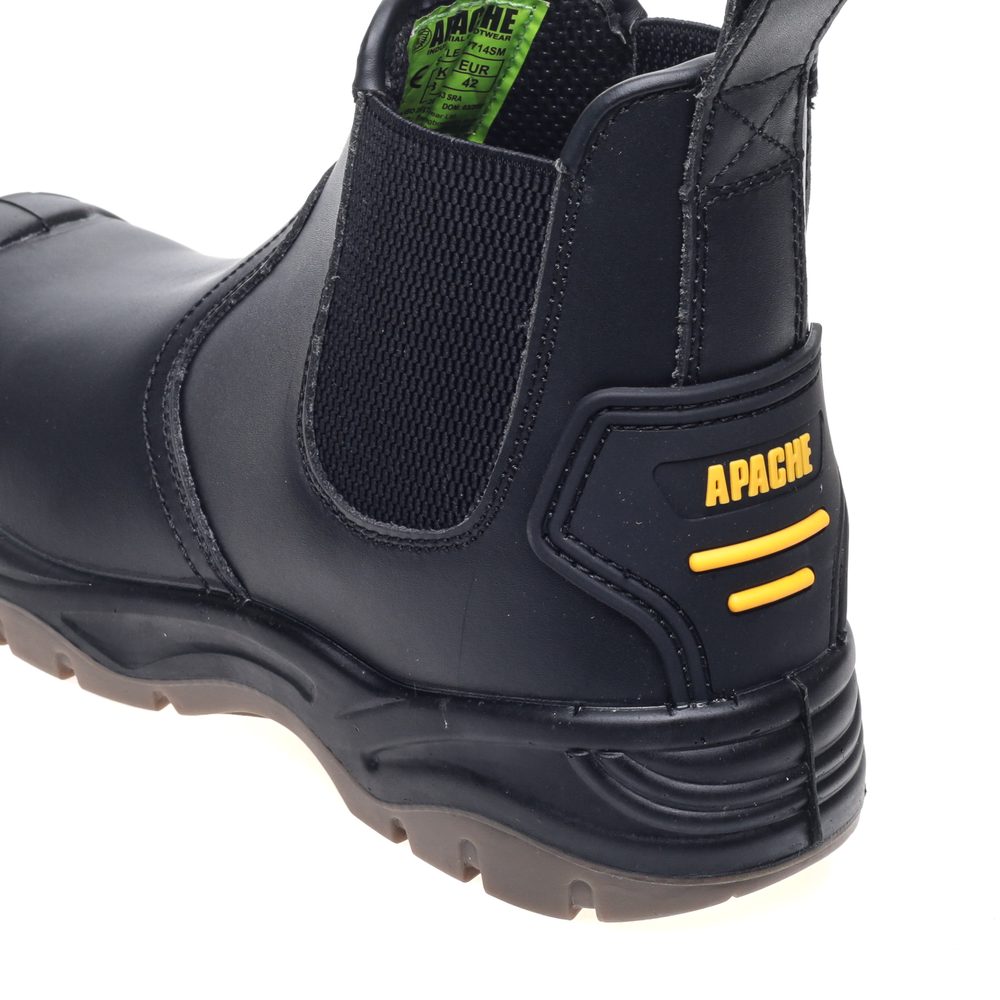 - Black Safety Dealer Boot • Leather • The Apache AP714SM is a tough, water-resistant dealer safety boot built for demanding working environments. Featuring elasticated side panels for easy entry, it offers convenience without compromising on protection. A steel toe cap and steel midsole safeguard against impact and penetration hazards, while the dual-density PU