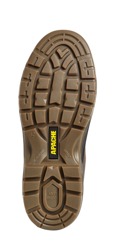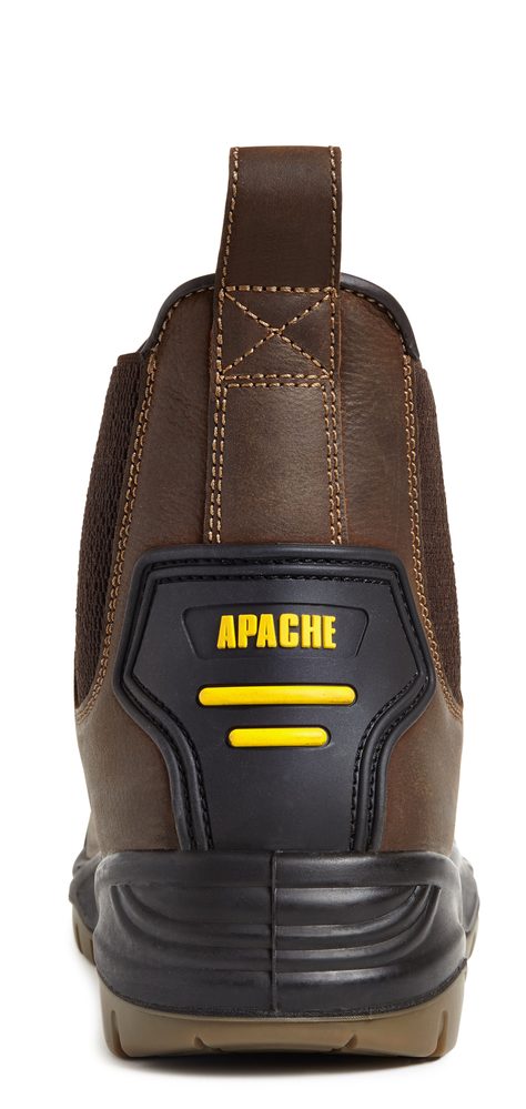 - Brown Safety Dealer Boot • Leather • The Apache AP715SM is a tough, water-resistant dealer safety boot built for demanding working environments. Featuring elasticated side panels for easy entry, it offers convenience without compromising on protection. A steel toe cap and steel midsole safeguard against impact and penetration hazards, while the dual-density PU