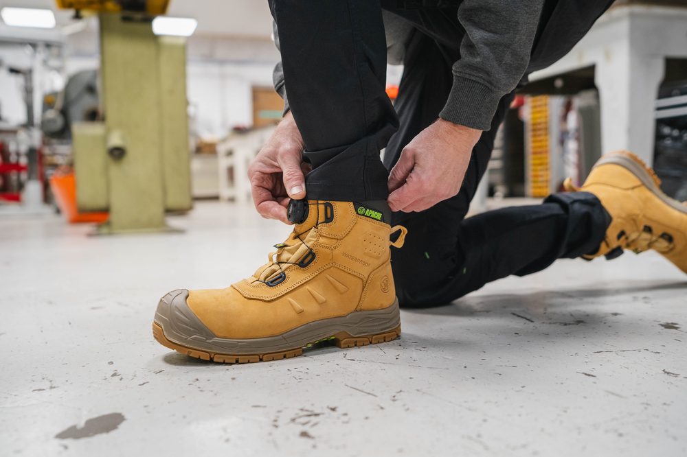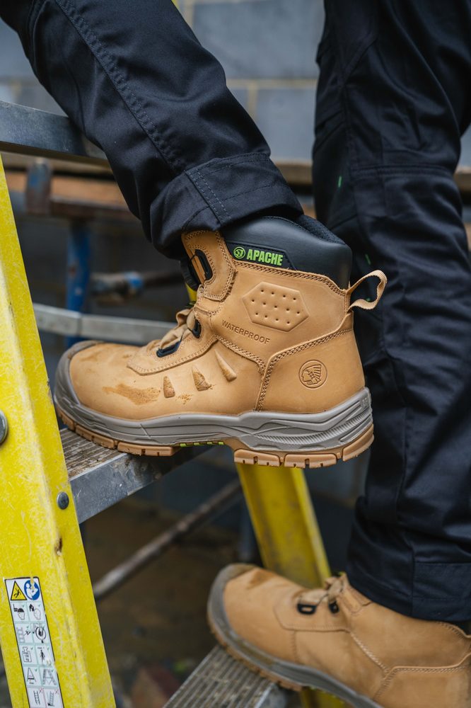 - Wheat Waterproof FITGO Safety Boot ESD • Full Grain Nubuck Leather • Apache Churchill — premium protection meets everyday comfort. This wide-fit, ESD-rated safety boot features a wheat full grain leather upper and a waterproof, breathable bootie to keep feet dry whatever the weather. The Fitgo lacing system delivers quick, precise fit adjustments, while a lightweight composite toe cap and midsole offer reliable protection. Finished with a renowned Core Comfort footbed and tough scuff cap for durability, plus our GTS Grip Traction System PU