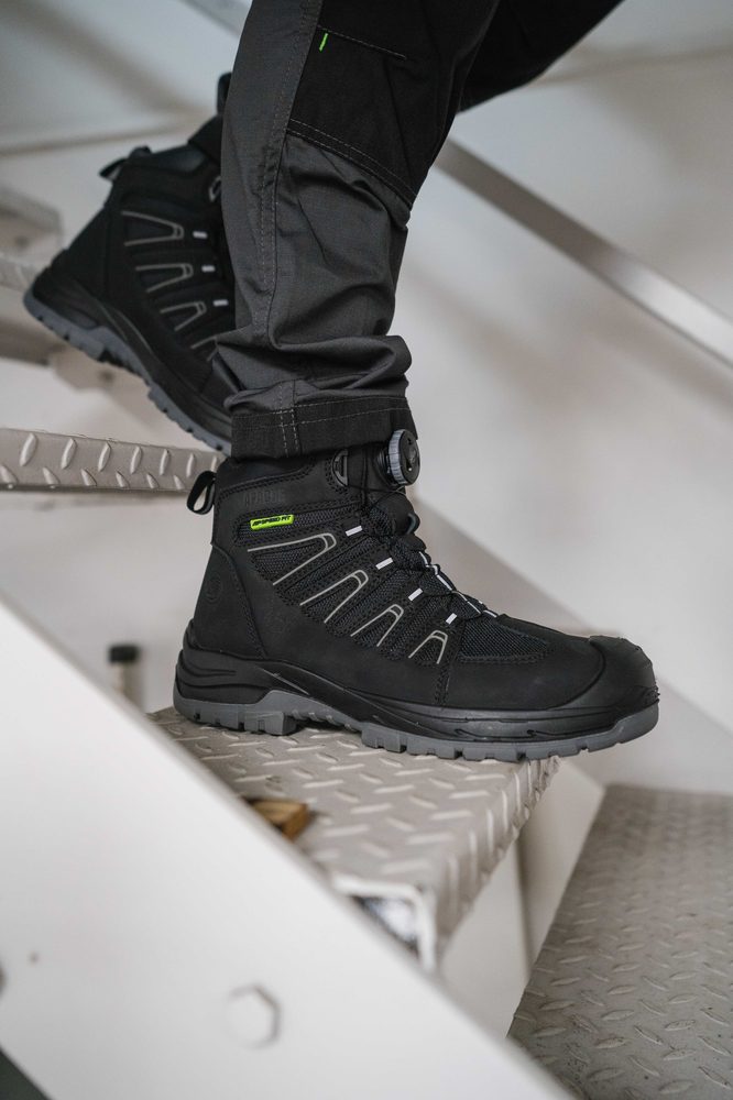 - FITGO GRS Recycled Leather Waterproof Safety Boot ESD • GRS Certified Recycled Leather • Apache Fort — built to handle anything. This wide-fit boot pairs a waterproof, breathable upper made from GRS-certified recycled leather with a lightweight composite toe and midsole for total protection. The innovative Fitgo lacing system lets you fine-tune your fit in seconds, while a padded tongue and collar, EVA comfort footbed, and tough scuff cap keep you comfortable and protected all day. Finished with a high-spec PU