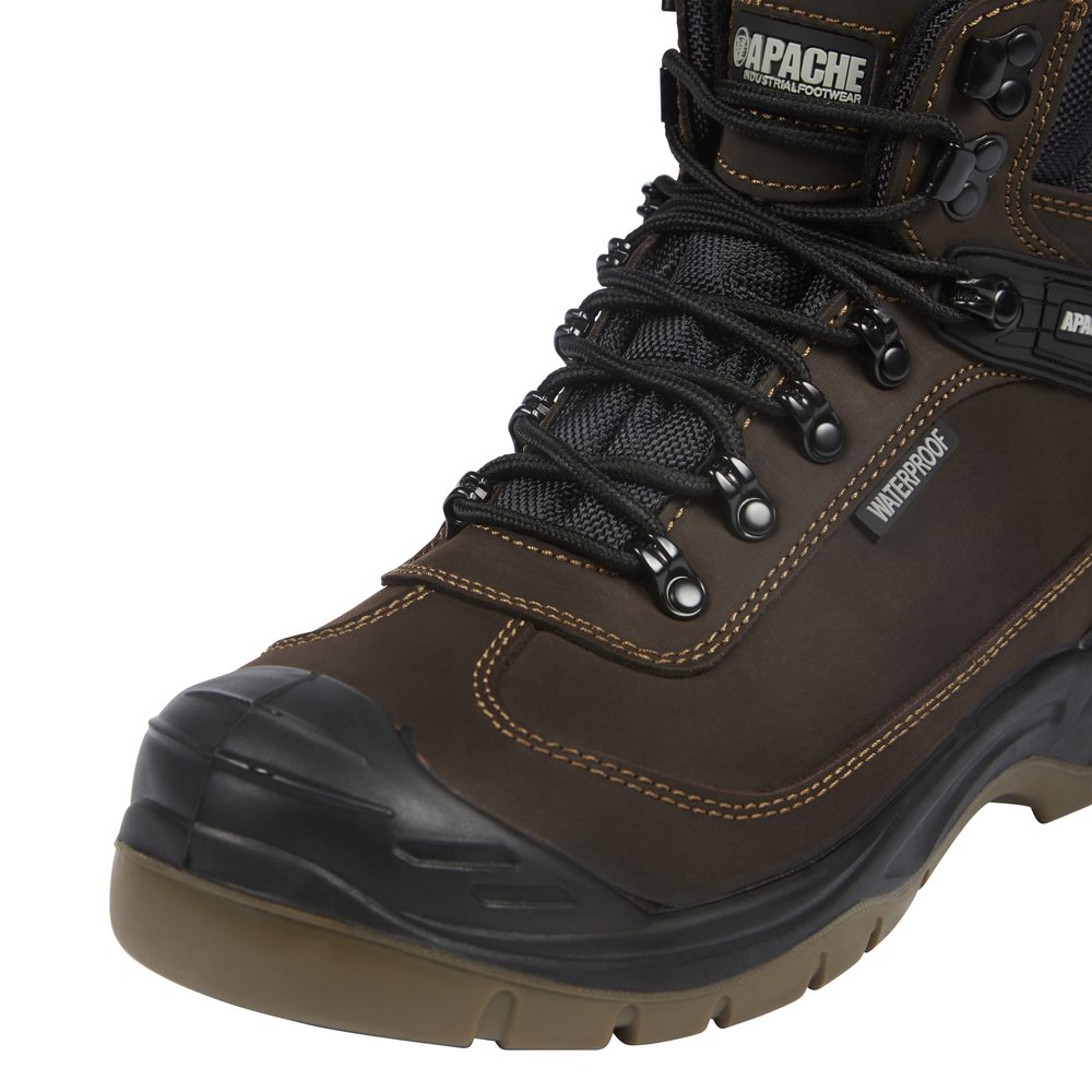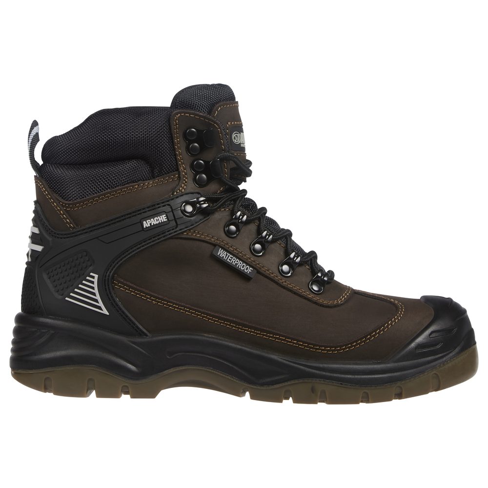 - Brown Waterproof Safety Hiker • Full Grain Leather • The Apache Ranger Brown is a durable, waterproof safety hiker designed for a wide range of outdoor applications. Crafted from brown full grain leather with a waterproof and breathable lining, it keeps feet dry and comfortable throughout the day. A padded collar and tongue enhance comfort, while the steel toe cap and steel midsole provide reliable protection. Additional features, including a TPU heel support, kick plate and dual-density polyurethane outsole with anti-scuff toe guard, ensure stability, and durability in demanding environments.