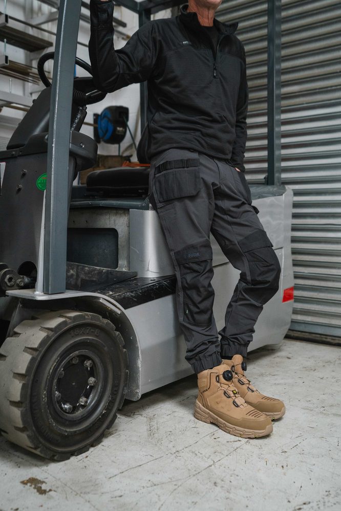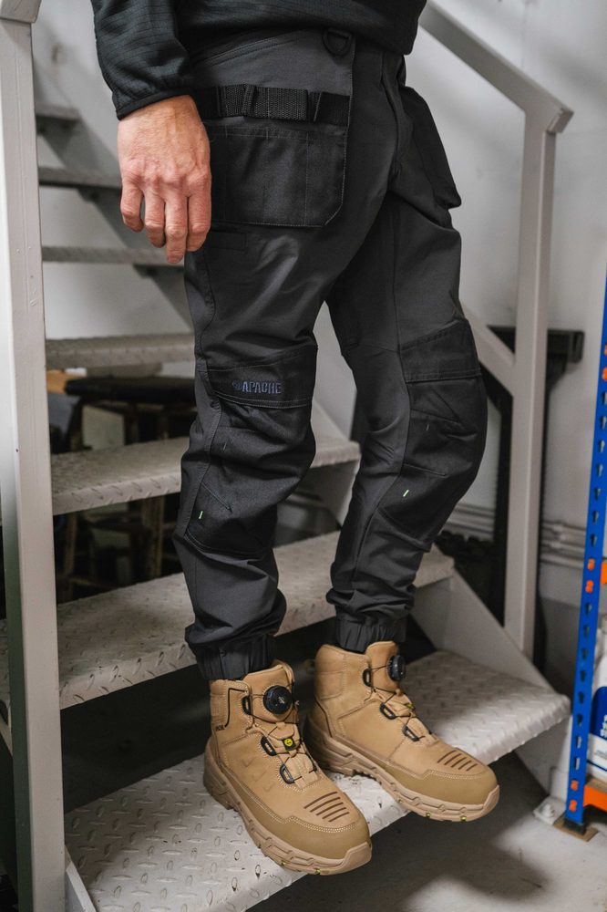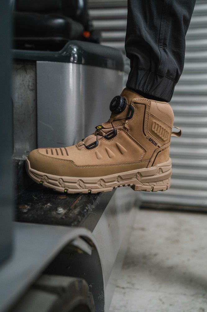 - Stone FITGO Safety Boot with Rebound EVA midsole & ESD • Full Grain Nubuck Leather • Apache Stonehenge — built tough for demanding environments. Featuring a stone full grain leather upper and a waterproof, breathable bootie to keep you dry on site. The Fitgo lacing system ensures fast, precision fit adjustments, while a steel toe cap and midsole deliver solid protection. Comfort comes from the padded tongue and collar plus an EVA footbed, while the brand new AP Return outsole combines a rebound EVA midsole for energy return with a durable rubber outsole. Certified to heat resistance up to 300°C, fuel oil resistance, ladder grip, slip resistance, and both heat and cold insulation. Finished with a texturised leather bumper that surrounds the boot for enhanced durability. ESD certified.