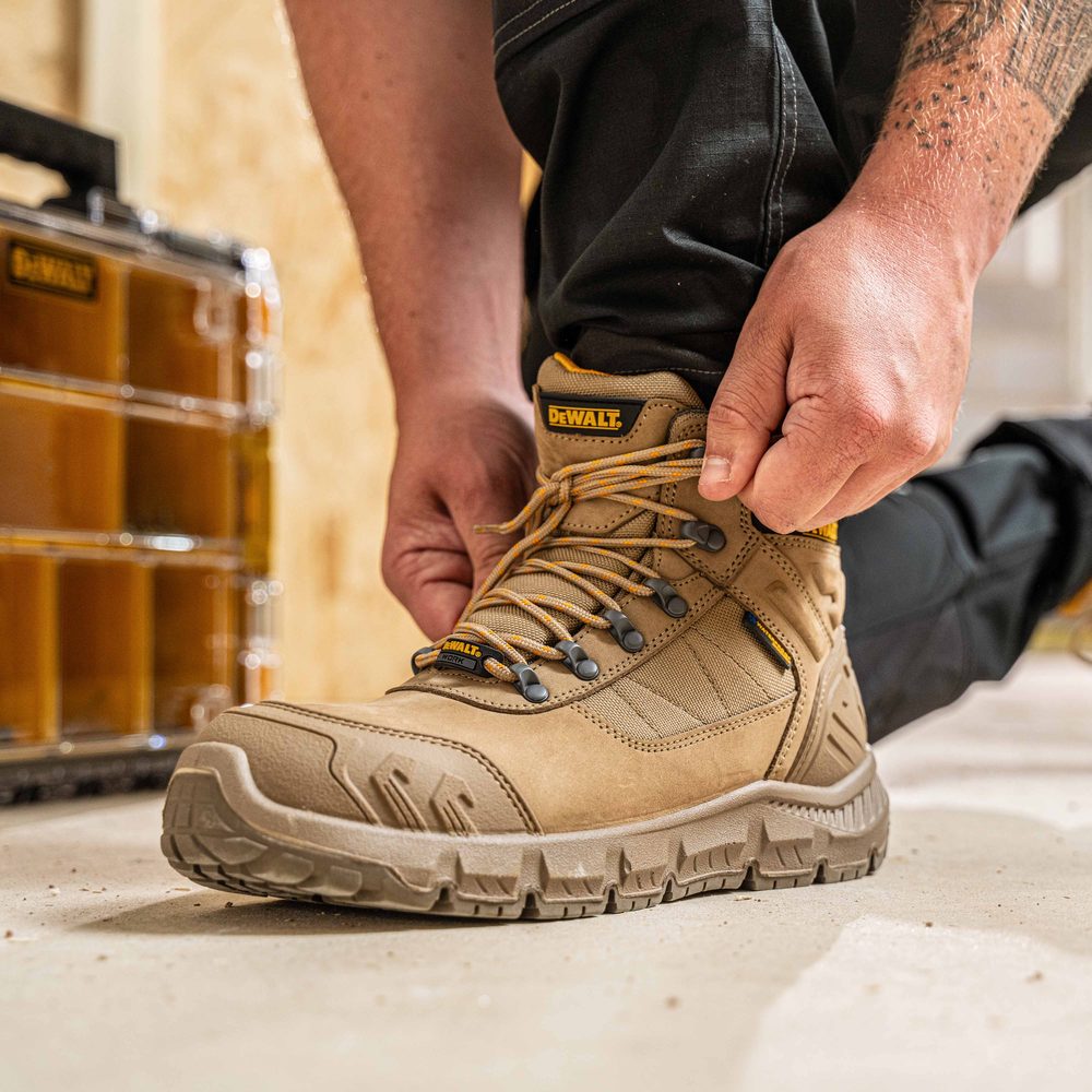 - DeWalt Stone Waterproof Boot with Overnose • Nubuck Leather • The DeWalt Milburn work boot provides a durable, waterproof option for those in need. With nubuck WR leather construction, a steel safety toe cap and midsole, these boots feature a PU midsole and rubber outsole for enhanced comfort and protection. Stay dry and secure while on the job with these top-of-the-line work boots.