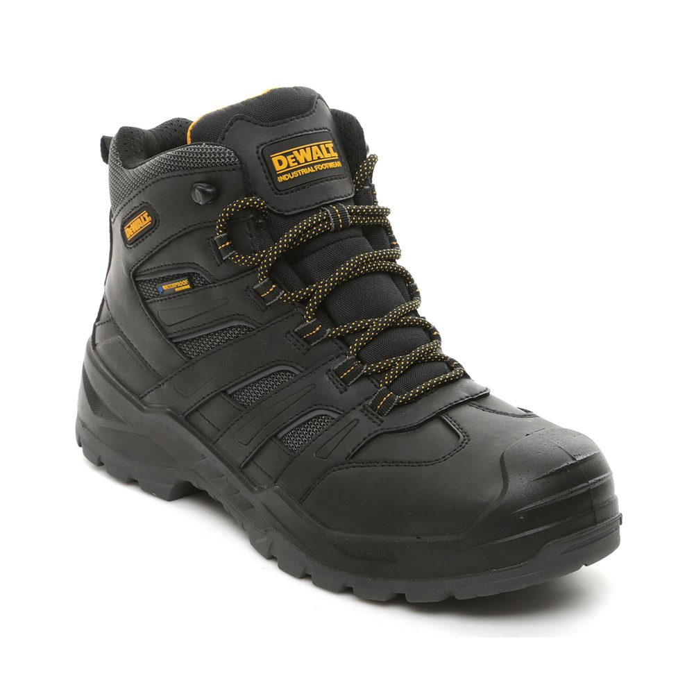 - Black Waterproof Safety Boot • Leather • DeWalt Murray is a waterproof, hiker style work boot. Murray has a leather and mesh upper and is manufactured with a waterproof and breathable bootie, steel toe cap and steel midsole protection. The boot has been made with a wider last to give a generous wider fitting. PU comfort insole. Padded tongue and collar for added comfort. The PU