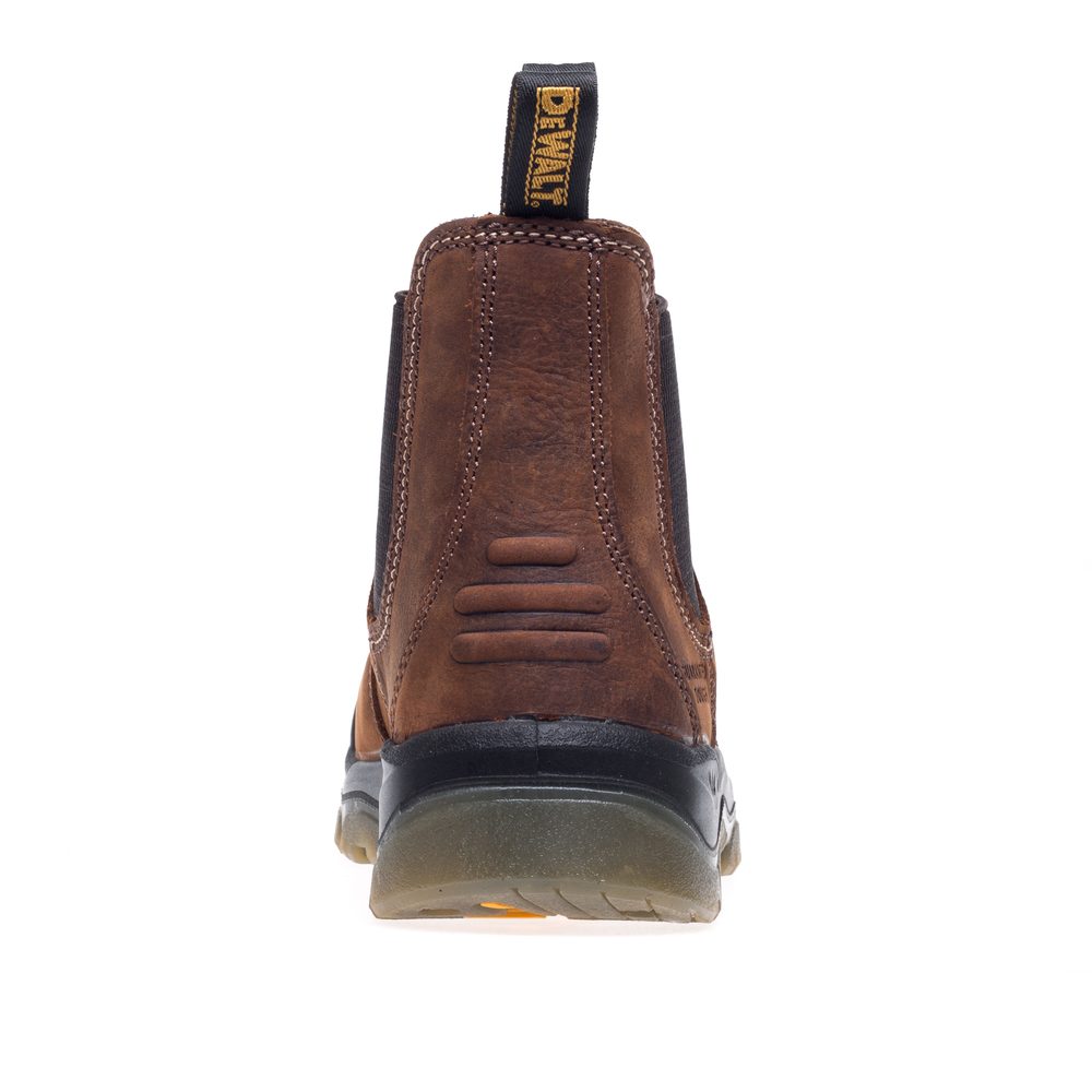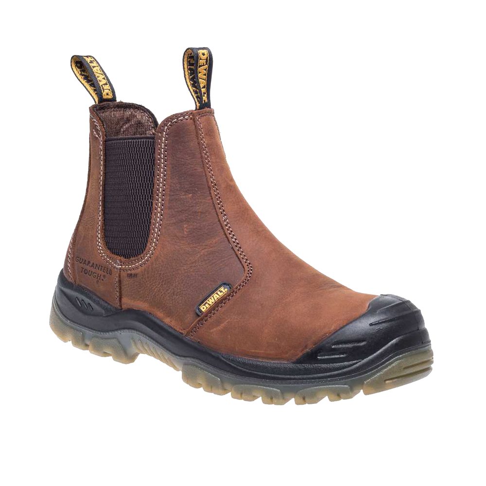 - Brown Dealer Boot • Full Grain Leather • Full grain water resistant leather upper. Steel toe cap and steel midsole protection. PU comfort insole. TPU dual density outsole. Anti-scuff toe protection. A high quality DeWalt safety boot for a number of working conditions.